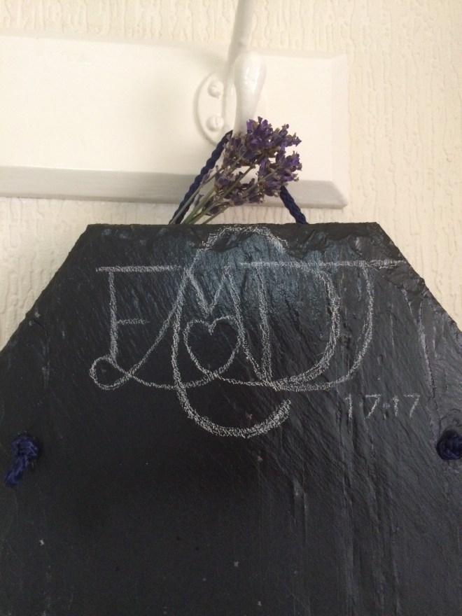 But it somehow set the ball rolling. Last night I wrote up my poems to the pc from the notebooks of my last trip it boosted my morale again finding out that I have almost reached my quota for my second book selection (a further 100 poems) and it seemed to trigger the writing again, suddenly whizzing around my head. This morning I wrote a poem about my friend who has invited me to her wedding next week. I plan to give it to her for a gift and thought that I need to do something else for them too. I am all for a bit of upcycled giftware and have made her a recycled roof slate chalkboard with the wedding couples initials in a logo and the date of their union. The slates were reclaimed from Scotland. I have a few of them I intended to make up for some friends and family or perhaps sell at a later date.